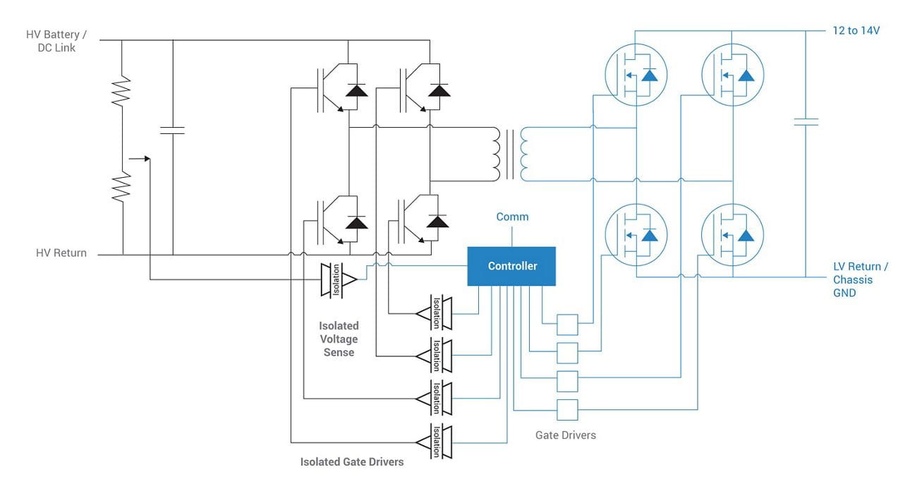 When under medium to heavy loading, APM may be in the 2 to 3 kW range with expected efficiency in the 92-95% range. The return/ground for the low-voltage side is normally connected to the vehicle chassis, so galvanic isolation between the LV side and HV side is required for safety, as well as for protection of the LV controller. Isolation between the HV input and the LV output of the converter is accomplished using a transformer. Switching frequencies can be relatively high (e.g. 100 kHz) to keep transformer magnetics sizes minimal.