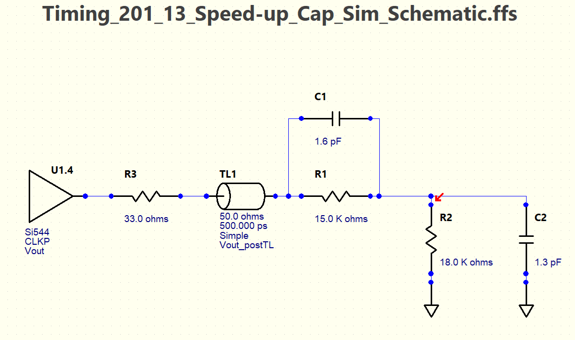 Attached is a relatively simple HyperLynx schematic, Timing_201_13_Speed-up_Cap_Sim_Schematic.ffs. See the screen capture below. R1 and R2 constitute the Rseries and Rshunt resistive voltage divider components. U1 is the Si544 I2C programmable oscillator sourcing the LVCMOS clock. R3 is the Near End Termination or series matching resistor necessary when driving into a tranmission line load. C1 is the speed-up capacitor and C2 is the load capacitor otherwise referred to as CL. TL1 is a simple 50 Ω lossless transmission line with adjustable delay.