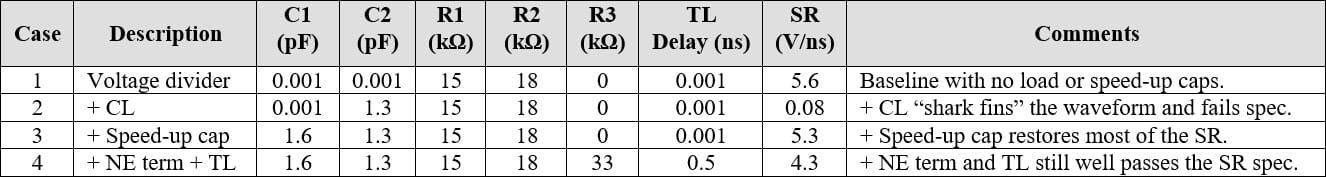 As a demonstration of how the speed-up cap can minimize slew rate degradation, I will be simulating several cases in HyperLynx. The goal is to voltage divide a 3.3 V clock down to 1.8 V and meet Si5363 jitter attenuator input clock slew rate requirements. Per the si5361-62-63-datasheet.pdf, LVCMOS (INx/INxb) Slew rate SR = min 0.2 or typ 0.4 V/ns. The main points of the simulations are listed below.