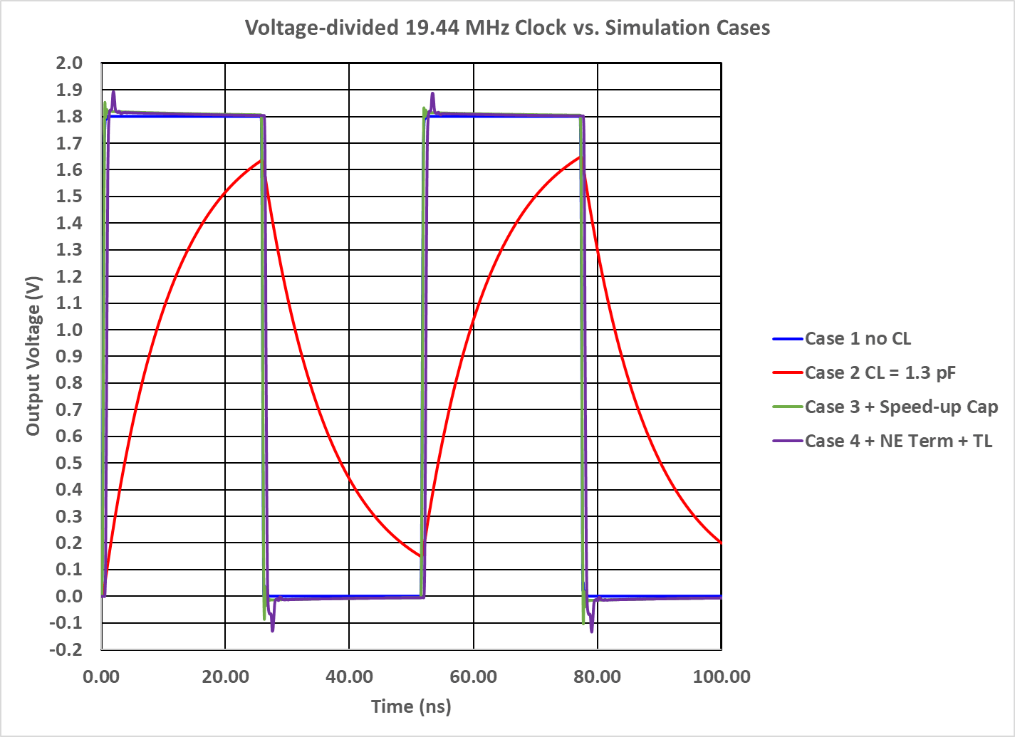 Also attached are the simulation results for each of the cases in Timing_201_13_Speed-up_Cap_Sims.xlsx. The results can best be understood by looking at the plots in worksheet “Plots” and reproduced below. There is also a “Zoom Plots” worksheet that looks at the rising edges where you can see the transmission line delay. Cases 1, 3, and 4 have roughly similar edge responses versus the red Case 2 trace where the capacitive load “shark fins” the waveform.
