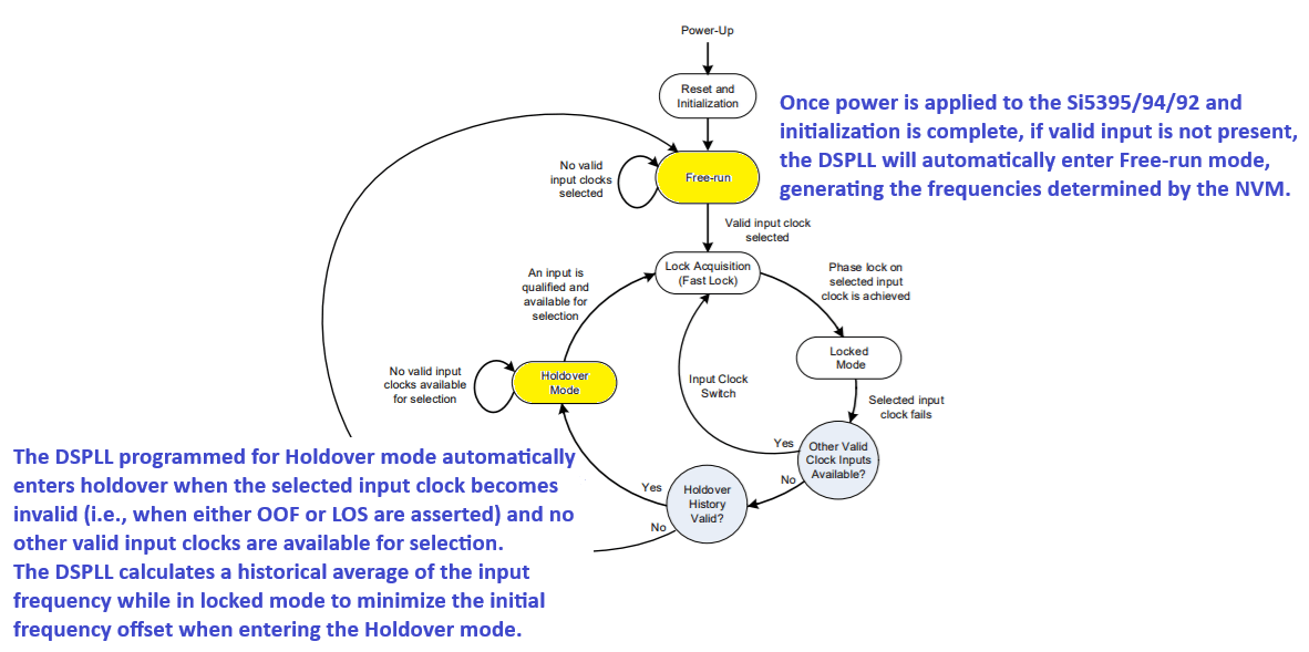 Below is an annotated and highlighted state diagram modified after Figure 2 in the Si5395/94/92 Reference Manual si5395-94-92-family.pdf that explains the transitions between states. The Reference Manual goes into more details. Note that, from a phase noise point-of-view, there is little difference between HO and FR except for the carrier frequency.