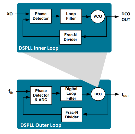 Consider the DSPLL Dual-Loop architecture in the figure below taken from Figure 2 in the White Paper Optimizing Clock Synthesis in Small Cells and Heterogeneous Networks. This basic approach is used in our dual-loop jitter attenuators such as the Si5395/94/92, Si5386, and Si5345/44/42. The Outer Loop (OL) Digital Loop Filter modulates the Inner Loop (IL) feedback divider and the IL VCO output is fOUT. In this architecture, the IL behaves as the “DCO” of the OL. As was discussed in previous blog posts, Timing 201 #7: The Case of the Dueling PLLs – Part 1, and Timing 201 #8: The Case of the Dueling PLLs – Part 2, the IL bandwidth must be much more wideband than the OL bandwidth. The Si5395 IL BW is fixed at ~ 1 MHz and the narrowband OL jitter attenuator bandwidths are selectable from 100 mHz to 4 kHz.