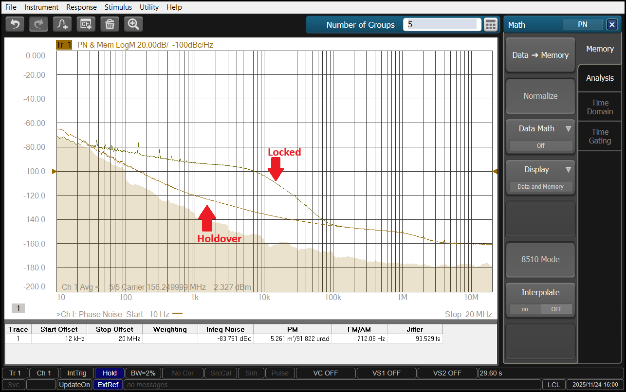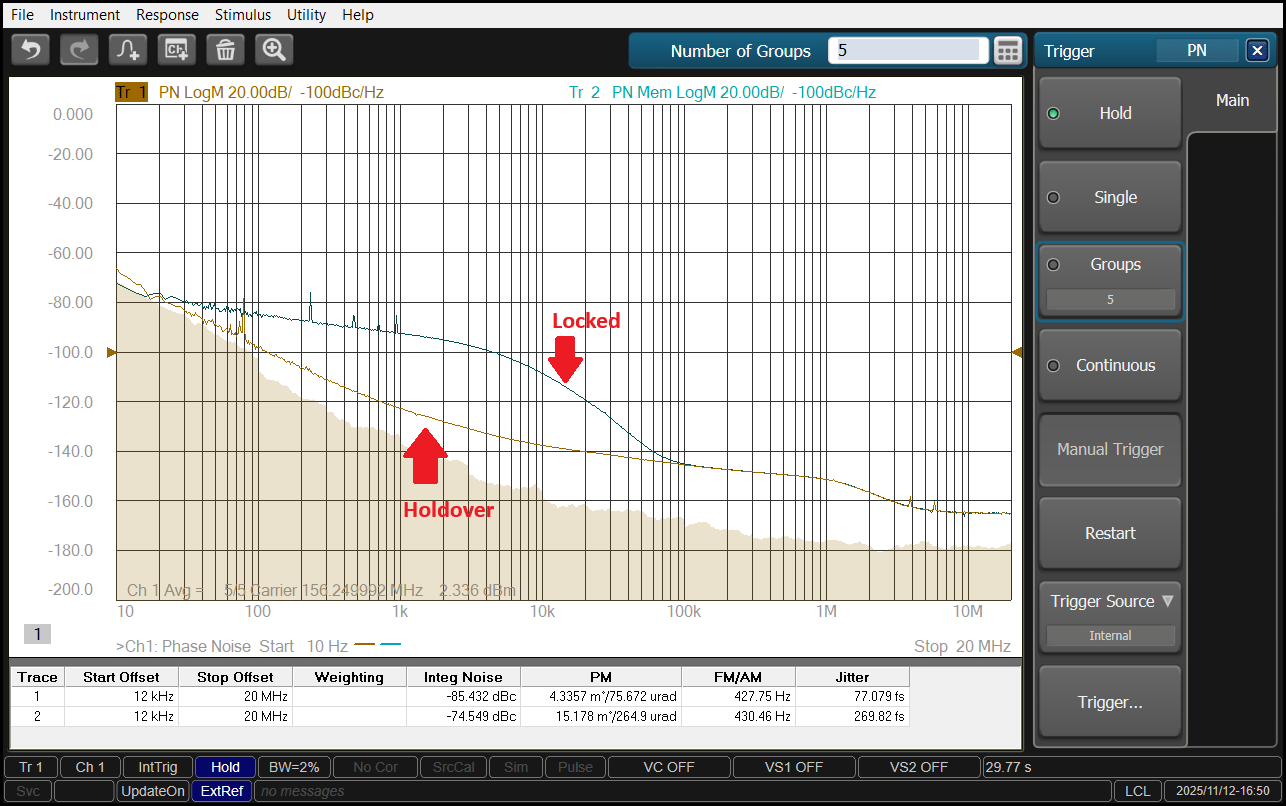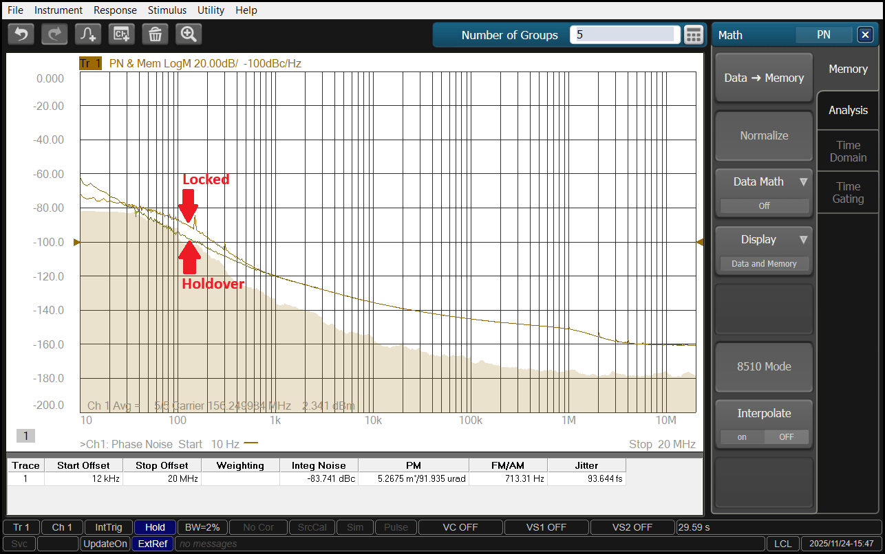 In the second example phase noise plot above, there is a data trace Tr1 for the Si5395 in HO and a memory trace Tr2 for the Si5395 when locked with BW = 4 kHz.