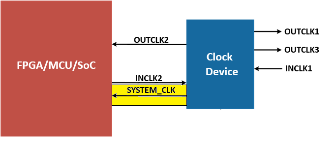 Consider the simplified block diagram below. There is a single Clock Device on the right hand side (a clock generator or jitter attenuator) which provides a SYSTEM_CLK to the system FPGA/MCU/SoC on the left hand side for basic operation after power-up. For the sake of this example, assume that if the SYSTEM_CLK is lost for some reason, then the FPGA/MCU/SoC cannot function. This makes SYSTEM_CLK a critical clock and its loss is a single point of failure for the system. Further, even if the clock device is otherwise still functioning, input clock INCLK2 to the Clock Device will be lost, and all INCLK2 contingent clocks will go into free-run or holdover.