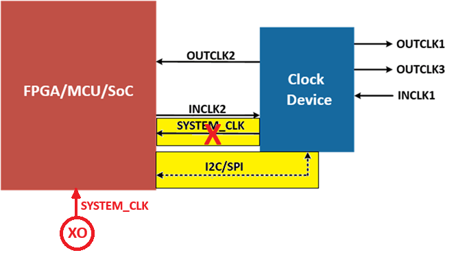 If the clock device’s output SYSTEM_CLK is independent and powers up straight away, what is the issue? In general, there is none. However, what if we place the clock device under serial bus control by the FPGA/MCU/SoC master device itself?