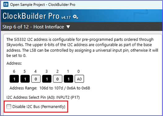 Finally, the Skyworks Si5332 clock generator uniquely supports the ability to disable the I2C bus via NVM when it is time to create an OPN. This feature is selected as noted below on the Host Interface page in CBPro. After the frequency plan has been settled during development with a base or other programmable Si5332, you can create a secure Si5332 OPN with I2C access permanently disabled, even if the bus is connected in hardware.