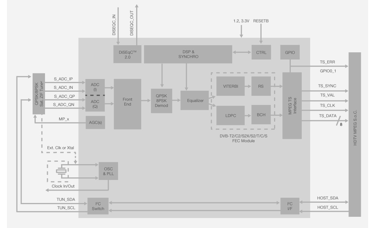 Si2166-D devices integrate digital demodulators for first and second generation satellite DVB standards, DVB-S2 and DVB-S2X/S2, respectively, in a single advanced CMOS die. Leveraging our proven digital demodulation architecture, Si2166-D devices achieve excellent satellite reception performance while significantly minimizing front-end design complexity, cost and power dissipation. Connecting Si2166-D devices to a satellite silicon tuner results in a high-performance and cost optimized TV or STB front-end solution.