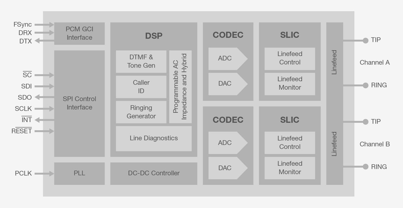 The Si3226x Dual ProSLIC® devices, in a single package, implement two complete foreign exchange station (FXS) telephony interfaces. The Si3226x devices operate from a 3.3 V supply. The Si32260/1 have standard PCM/SPI or GCI bus digital interfaces. Built-in dc-dc converter controllers can be used to automatically generate the optimal battery voltage required for each line-state, optimizing efficiency and minimizing heat generation.