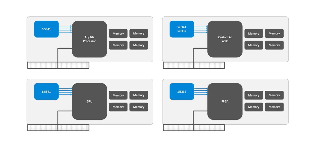 Accelerator cards provide servers with added processing power optimized to handle application specific workloads. Using a standard PCI-Express (PCIe) connector to a server motherboard or backplane, accelerator cards utilize GPUs, FPGAs, or specialized ASICs , which require an array of low jitter reference clocks for PCIe Gen3/4/5 or NVLink data buses, 28G/56G SerDes, and generic system functions. Our broad portfolio of programmable clock generator solutions can be easily customized to consolidate all reference clocks needed in an accelerator card design into a single IC solution to reduce component count, PCB area, and overall system cost.
