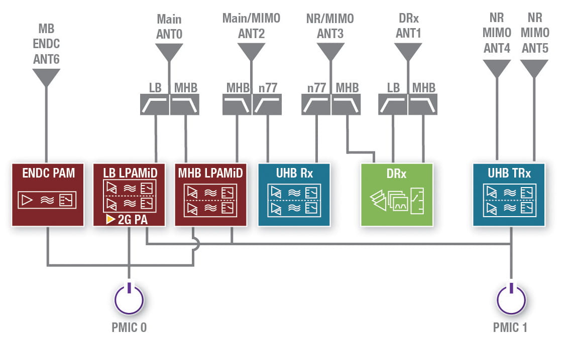 Leading operators in the EMEA region hold substantial spectrum bands in use for LTE and 5G, which requires unique band-pairings that are supported in Skyworks’ Sky5® award winning low-power, high-performance radio front-end products. A set of highly integrated modules that support all required bands and combinations is shown in the block diagram example below.