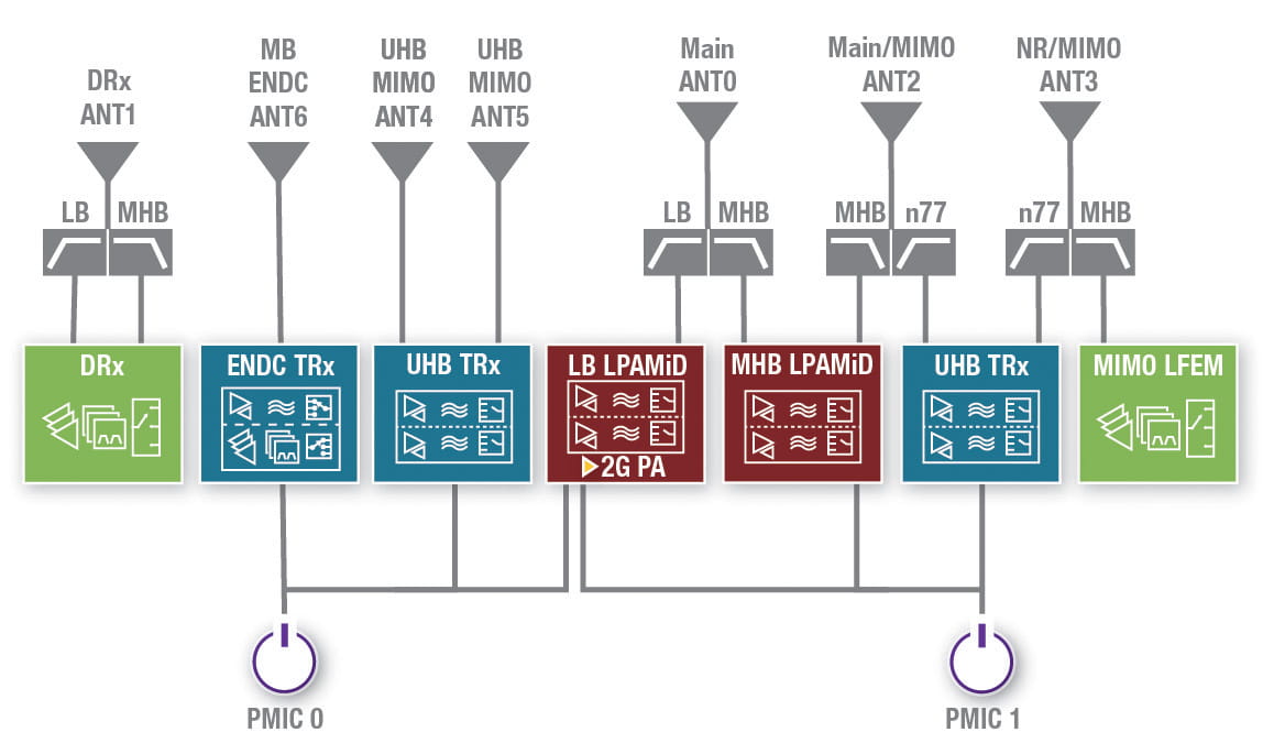 Major operators in North America have the most diverse set of spectrum allocations for LTE and 5G, which requires unique band-pairings that are supported in Skyworks’ Sky5® award-winning low-power, high-performance radio front-end products. A set of highly integrated modules that support all required bands and combinations is shown in the block diagram example below.
