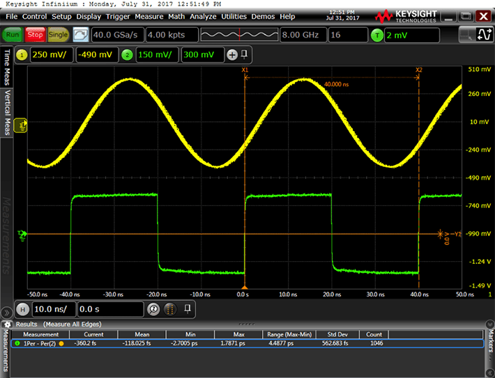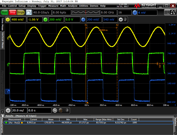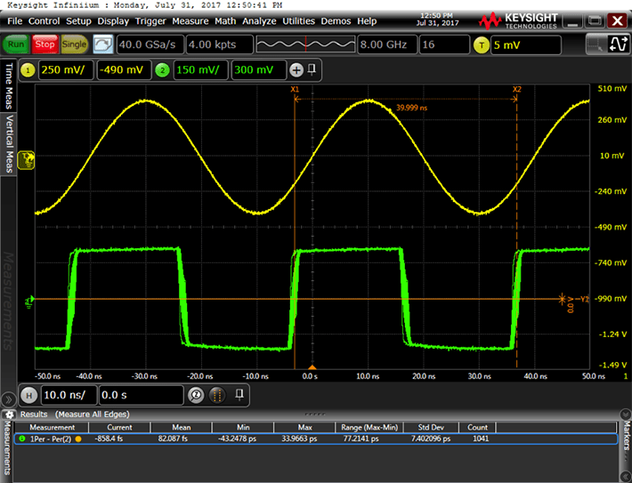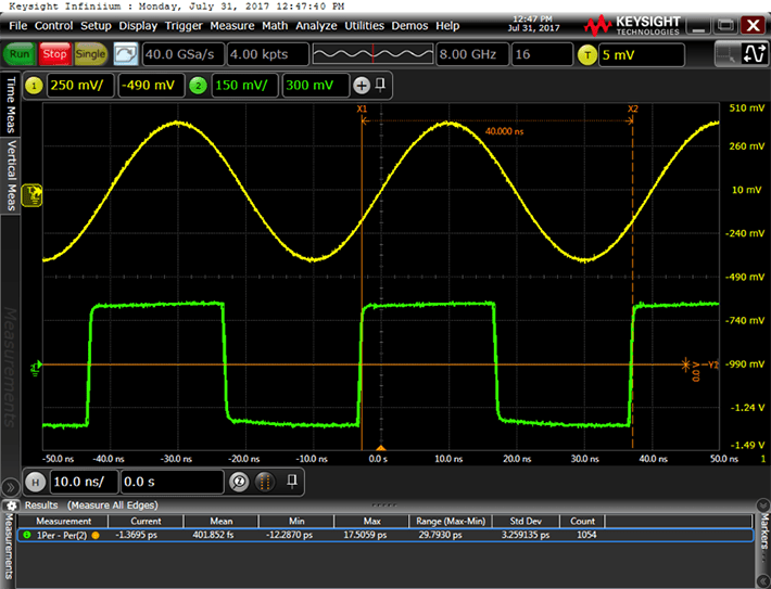 In the second instance, in the figure below, the jitter attenuator’s loop BW is 100 Hz and the output clock is much less jittery. In this particular example, the standard deviation of the jitter attenuated clock’s cycle to cycle jitter dropped from 8.2 ps to 1.1 ps when the loop BW was decreased from 4 kHz to 100 Hz.