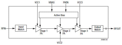 The SKY66397-12 is a high-efficiency fully input/output matched power amplifier (PA) with high gain and linearity. The compact 5 X 5 mm PA is designed for FDD and TDD 2G/3G/4G LTE small cell base stations operating from 2300 to 2700 MHz. The active biasing circuitry is integrated to compensate PA performance over temperature, voltage, and process variation. The SKY66397-12 is part of high-efficiency, pin-to-pin compatible PA family supporting all 3GPP bands. Table 1 lists the pin-to-pin compatible parts in the PA family.