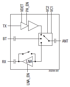 The SKY85310-21 provides a complete 2.4 GHz WLAN RF solution from the output of the transceiver to the antenna, and from the antenna to the input of the transceiver. The LNA increases the receive sensitivity of embedded solutions to improve range or to overcome the insertion loss of cellular filters (often included for mobile applications).