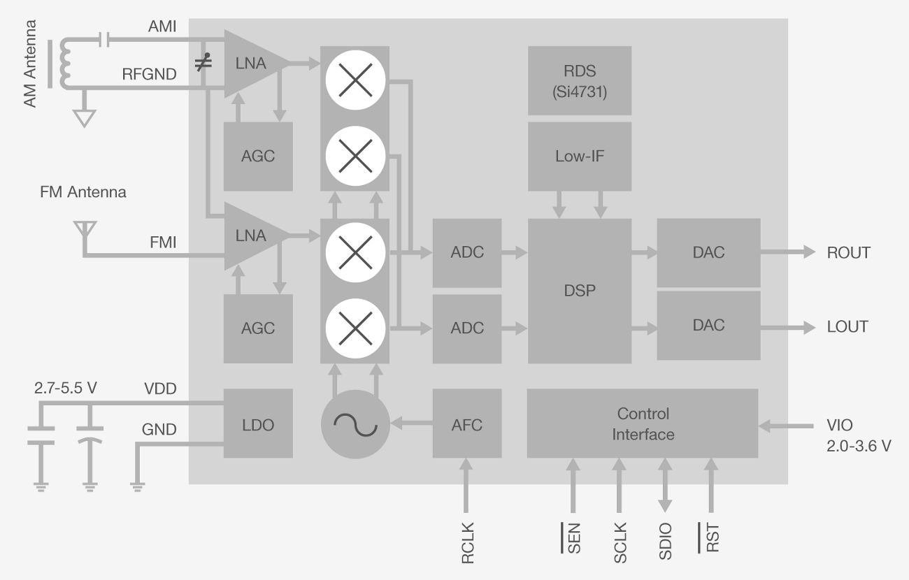Our Si473x-D60 devices are the industry’s first integrated AM/FM tuners with an AUXIN ADC, offering unparalleled integration, audio quality, and performance for consumer audio applications requiring low power dissipation, minimal board area and exceptional audio processing. Si473x-D60 tuners offer a stereo analog input and internal ADCs multiplexed with the radio tuner front-end to support auxiliary analog system inputs without the need for additional external ADCs.