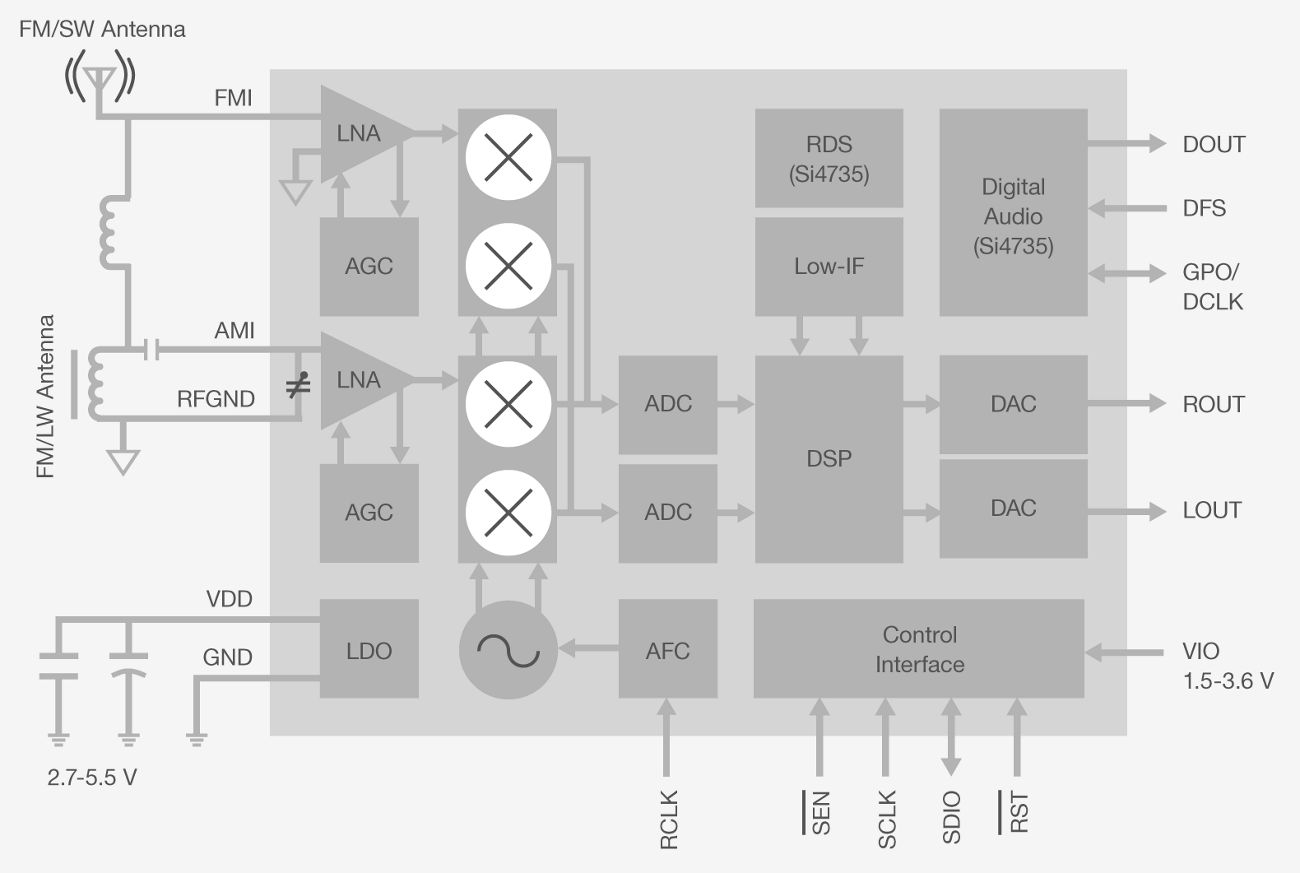 Si4734/35 devices are the industry's first fully integrated, 100% CMOS AM/FM/SW/LW radio receivers. Si4734/35 AM/FM/SW/LW radio receivers provide space savings and low-power consumption necessary for portable devices while delivering high performance and design simplicity desired for all AM/FM/SW/LW solutions. With unmatched integration and PCB space savings, Si4734/35 ICs require minimal external components and less than 20 mm² of board area, excluding the antenna inputs.