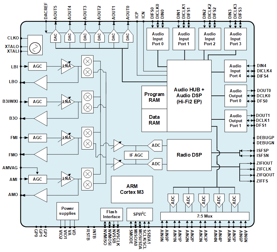 Si4791x devices are the most integrated monolithic ICs in the industry with the smallest external bill of materials. The Si4791x devices set a new standard for automotive broadcast reception by integrating analog AM/FM receiver and digital radio tuner with audio processing. The integrated audio processing sub-system provides a complete solution to synchronize, process, aggregate, and distribute digital and analog audio signals in the head-unit. The Si4791x devices include a set of audio software products and tools available for license, providing a complete solution for audio post-processing in the radio.