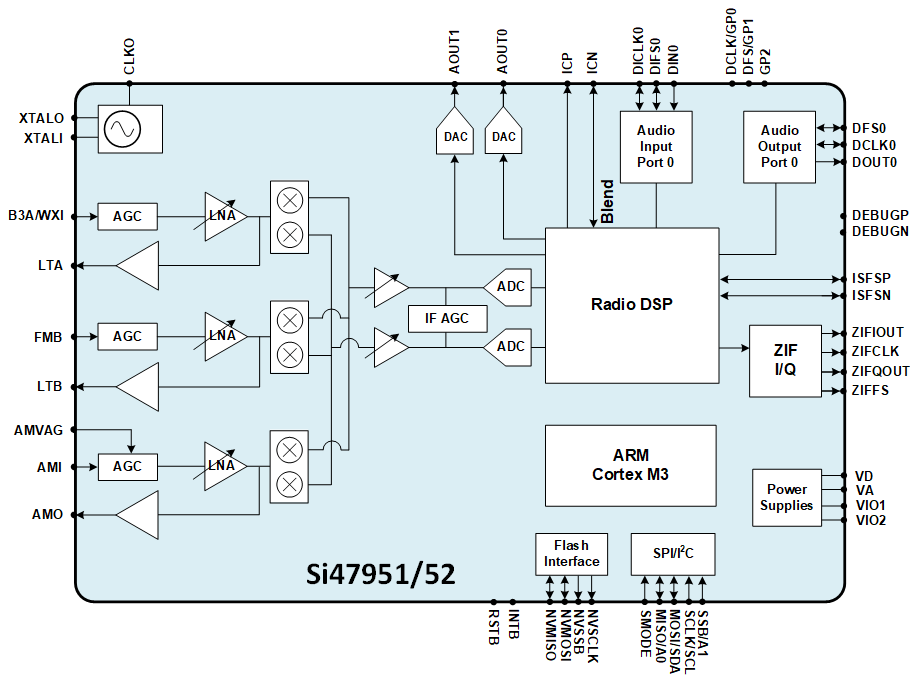Si4795x devices are high-performance automotive AM/FM radio receivers and digital radio tuners with the smallest external bill of materials. The Si4795x devices set a new standard for automotive broadcast reception. The Si4795x devices are pin/package and API compatible with Si4795x and Si4796x device families, thus, enabling radio suppliers to scale designs from Low-end to High-end, covering all product segments.