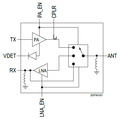2.4 GHz low-noise amplifier (LNA) with bypass, and a 2.4