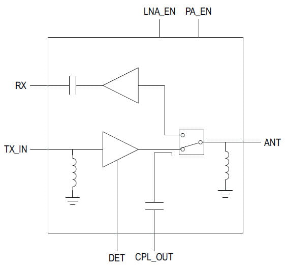 2.4 GHz single-pole, double-throw (SPDT) transmit/receive (T/R) switch, a 2.4 GHz low-noise amplifier (LNA) with bypass, and a 2.4 GHz power amplifier (PA) with an integrated digital pre-distortion (DPD)