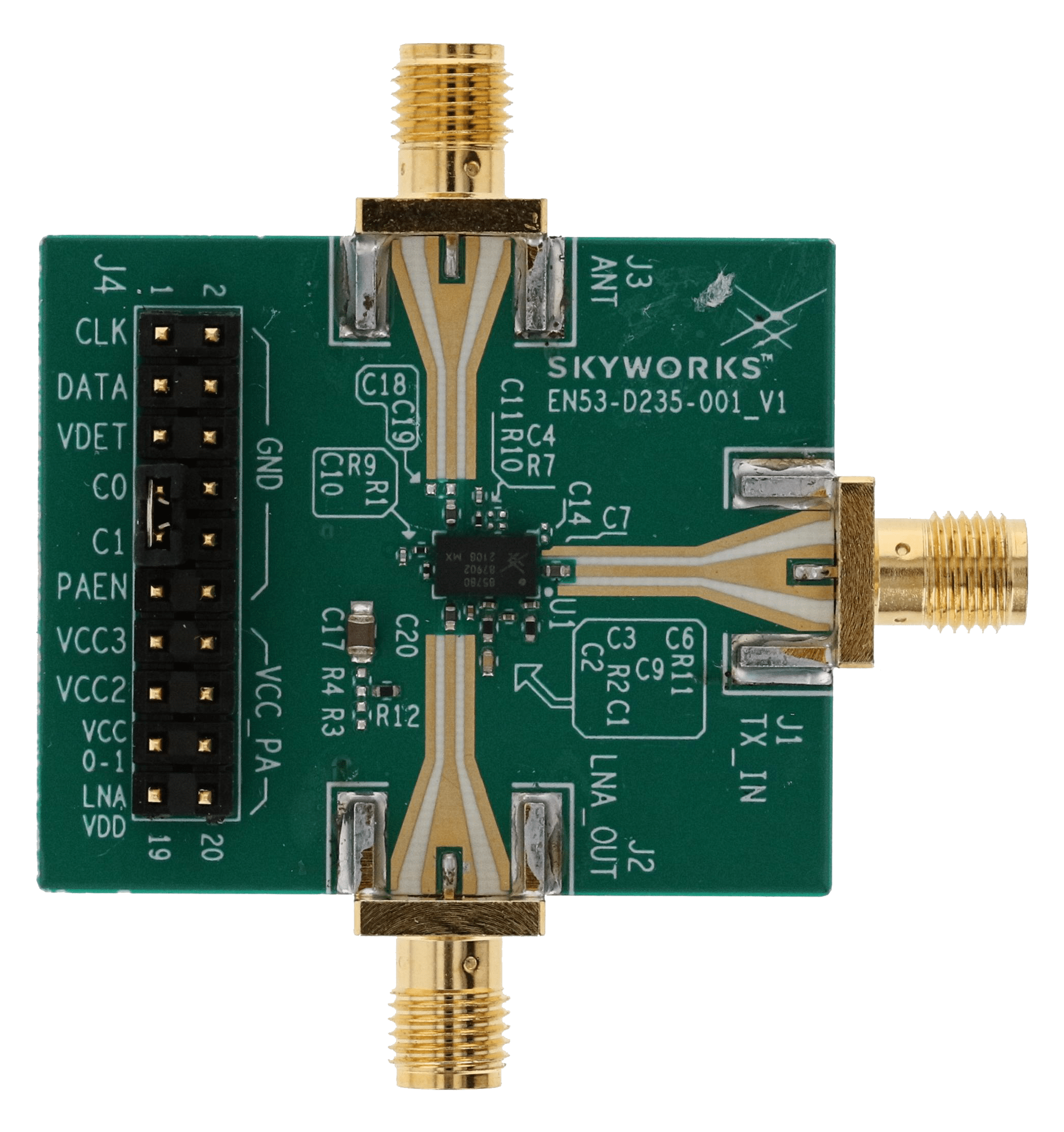 The SKY85780-11 is a highly integrated, front-end module (FEM) incorporating a single-pole, double-throw (SPDT) transmit/receive (T/R) switch, a high-gain low-noise amplifier (LNA) with bypass, and a power amplifier (PA) intended for high-power WiFi 6E applications and systems. The device is provided in a compact, 24-pin 3 x 5 mm package, which may reduce the front-end board space by more than 50 percent.