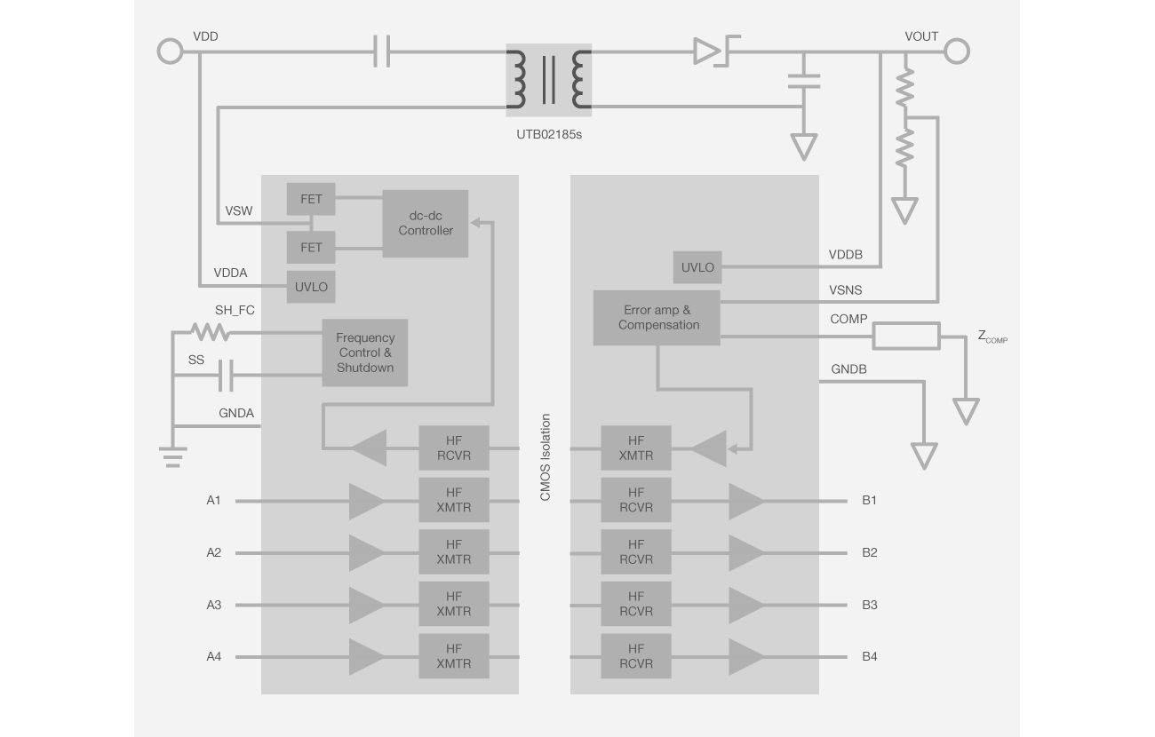 Si88xx devices offer up to four high speed digital isolation channels integrated with a modified fly-back topology based dc-dc converter working in conjunction with an external transformer to provide up to 5 W of isolated power with a 24 V input supply. An external switch is used to supply the secondary side of the Si88xx, as well as other circuits on the isolated side with an isolated 5 V supply. The converter includes safety soft start, thermal detection, and cycle-by-cycle current limiting safety features, as well as built-in secondary sensing and feedback through the isolation barrier back to the controller, resulting in excellent line and load regulation for system stability.