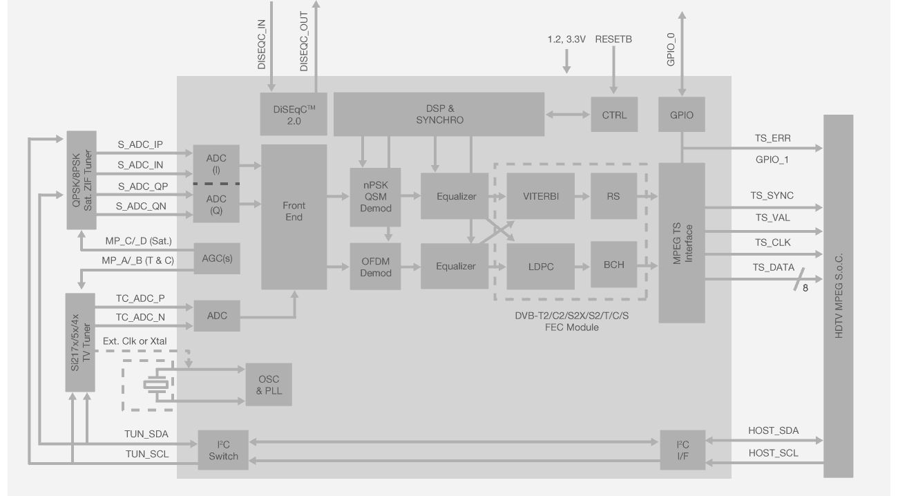 Our DVB-C2 demodulators accept a standard IF (36 MHz) or low-IF input (differential) and support all modes specified by the DVB-C2 standard. Main features of the DVB-C2 mode include: 4096-QAM, 6 or 8 MHz bandwidth, management of notch insertion (broadband and narrowband) and support of multiple data slices and PLPs. DVB-T2/T, DVB-S2X/S2 and DVB-C demodulator IP blocks are enhanced versions of Si2169/68/67/66 devices. DVB-T2-Lite (ETSI EN 302 755-V1.3.1) compatibility is also supported.