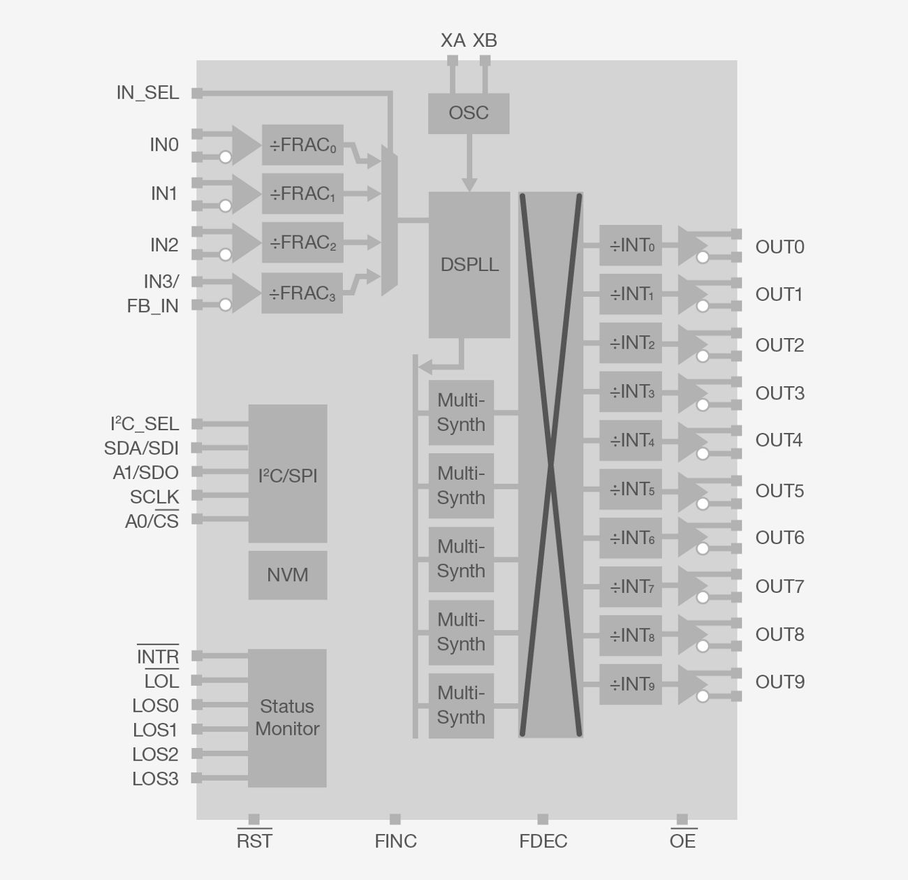 High performance Jitter Attenuator clocks utilize DSPLL® and MultiSynth™ technologies to deliver best-in-class jitter cleaning. They are able to deliver any combination of output frequencies/formats from any input frequencies/formats and deliver low jitter with all clocks enabled. The Si5361/2/3 offer up to 18 outputs with best-in-class jitter performance of 55fs with all clocks running. The SKY63104/5/6 is a small form-factor 8x8 device with 12 outputs and best-in-class jitter performance of 55fs. General purpose legacy jitter attenuators like Si5392-97 are also available for applications that have less stringent jitter specs.