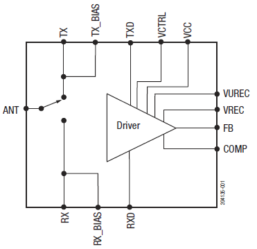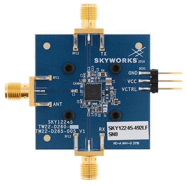 The SKY12245-492LF is a compact, integrated high-power single-pole, double-throw (SPDT) PIN diode switch with driver circuit for TDD-LTE and similar applications. The part operates with a single +5 V supply and switches with a single control voltage (0 to 3 V). It can be tuned to specific RF bands within the range of 0.3 to 5.0 GHz by modifying select external SMT components. This device features low TX and RX insertion loss, high isolation with low DC power consumption and requires minimal external components, enabling a smaller PCB footprint. The device is provided in a 5 x 5 mm, 20-pin Quad Flat No-Lead (QFN) package.