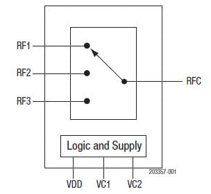 switched RF outputs (RF1, RF2, or RF3) by using a low insertion