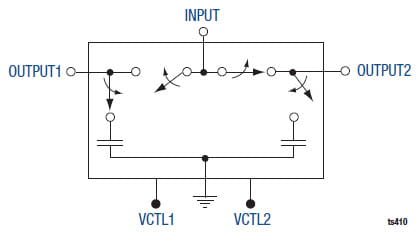 the RF common port (INPUT, pin 5) to either the OUTPUT1 or