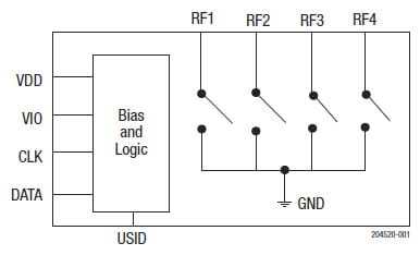 single-throw (4xSPST) switch designed for antenna tuning